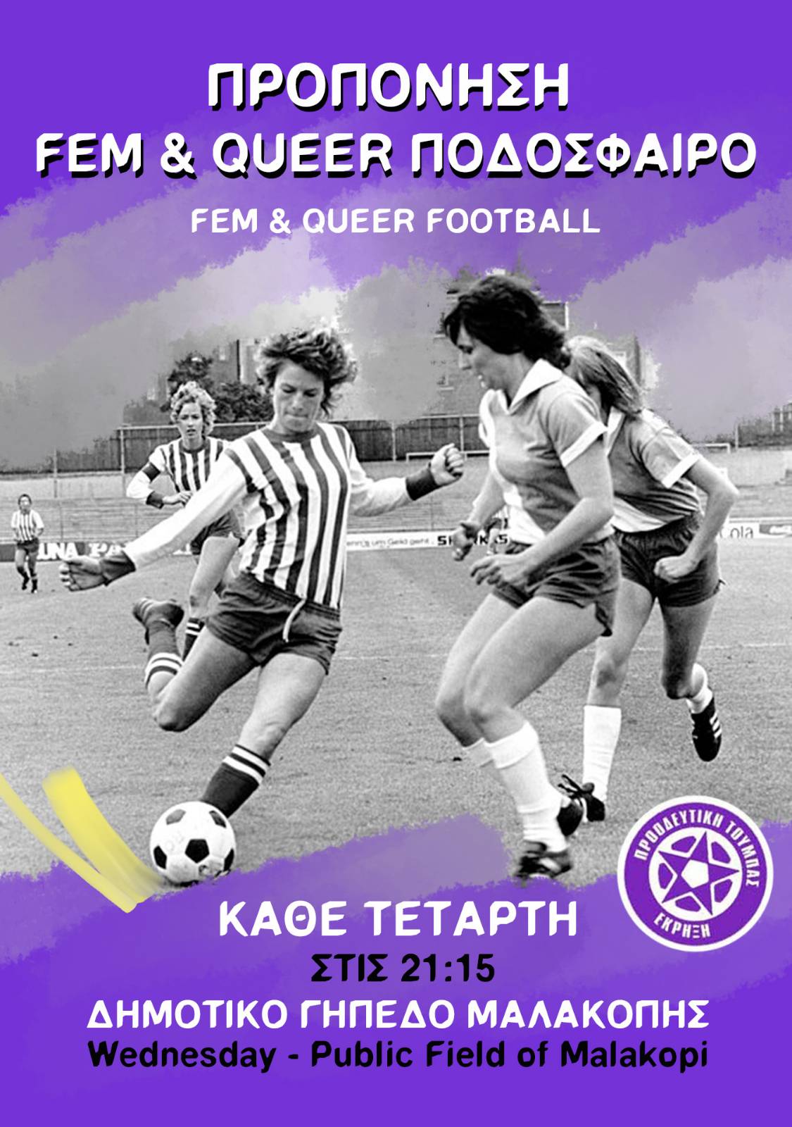 Κουήρια και θηλυκότητες, άμπαλα και μη, γεμίσαμε πέρσι το γήπεδο στη Μαλακοπή και ξεκινήσαμε να παίζουμε, έτσι για τη φάση μας. Αυτοοργανωθήκαμε και μάθαμε μπάλα το ένα από την άλλη, πέρα από τα στενά όρια του εμπορευματικού και ανταγωνιστικού ποδοσφαίρου. Κόντρα στο στρατηγικό αποκλεισμό μας από τα γήπεδα, τα επανοικειοποιηθήκαμε συντροφικά και αφιερώσαμε τα δικά μας γκολ.
